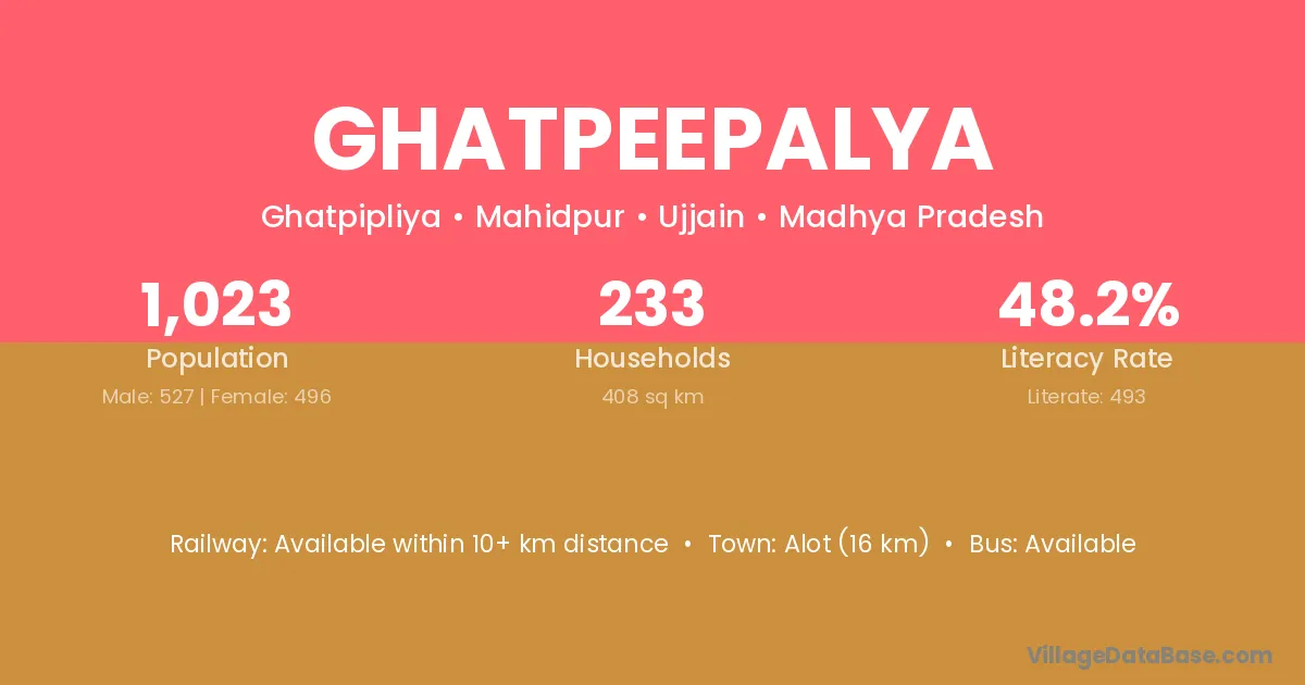 Ghatpeepalya village has a total population of 1,023 people, of which 527 are males and 496 are females.