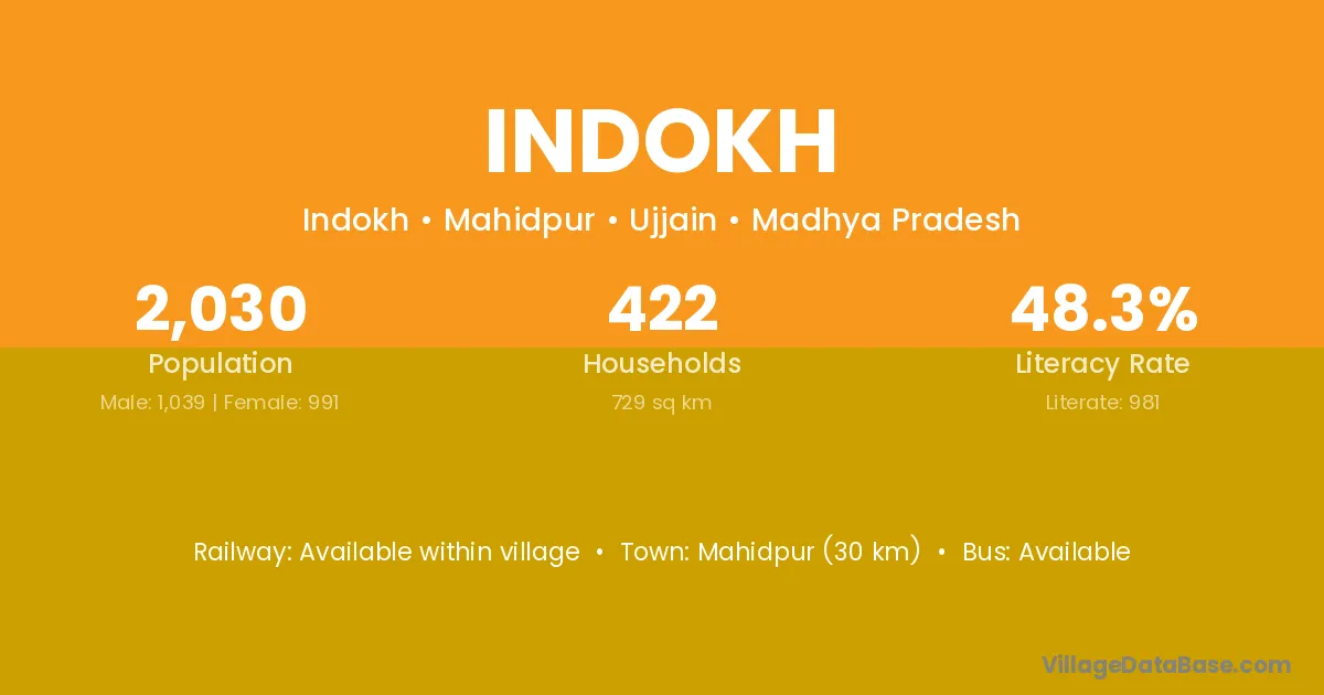 Mahidpur (30 km) is the nearest town to Indokh village for major economic activities and is located approximately 30 km away.
