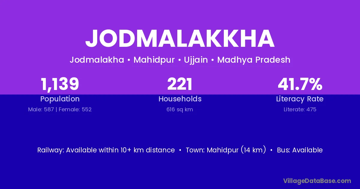 Mahidpur (14 km) is the nearest town to Jodmalakkha village for major economic activities and is located approximately 14 km away.