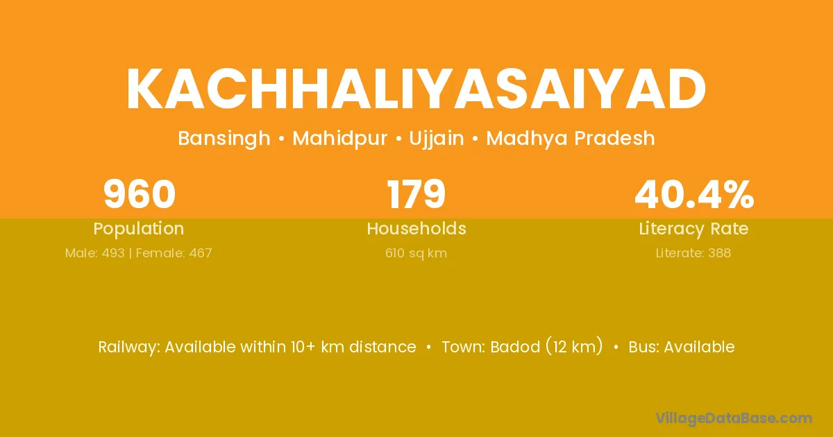 Kachhaliyasaiyad village has a total population of 960 people, of which 493 are males and 467 are females.