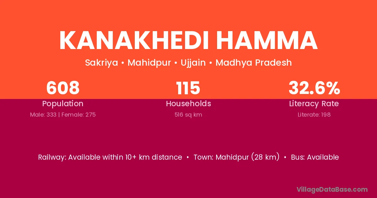 Kanakhedi Hamma village has a total population of 608 people, of which 333 are males and 275 are females.