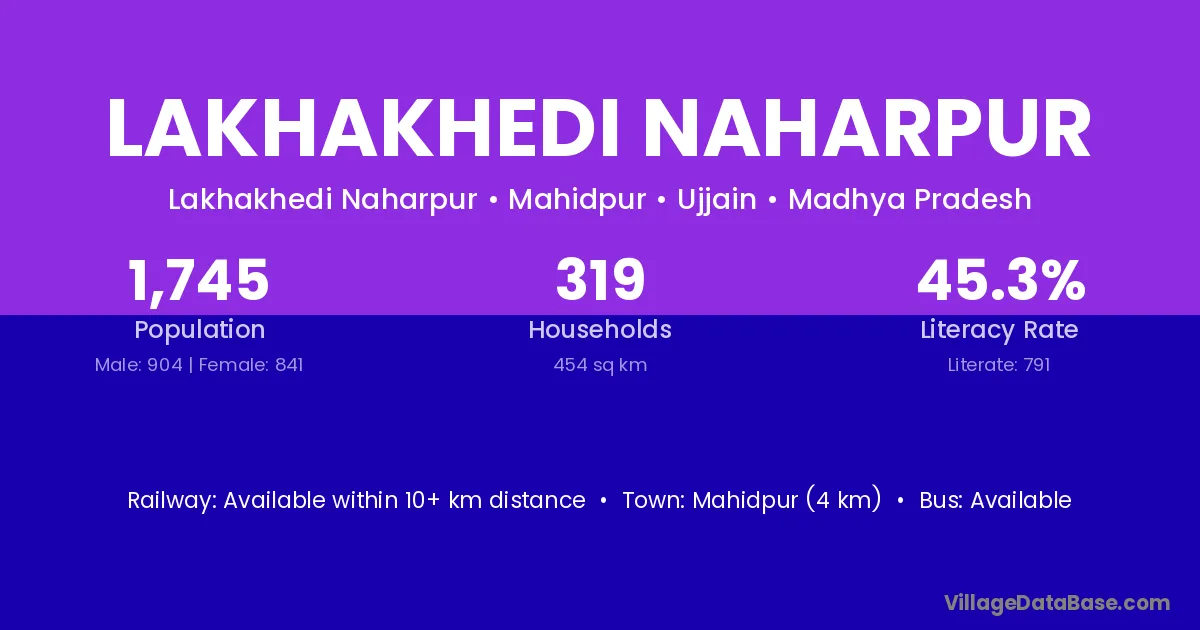 Mahidpur (4 km) is the nearest town to Lakhakhedi Naharpur village for major economic activities and is located approximately 4 km away.