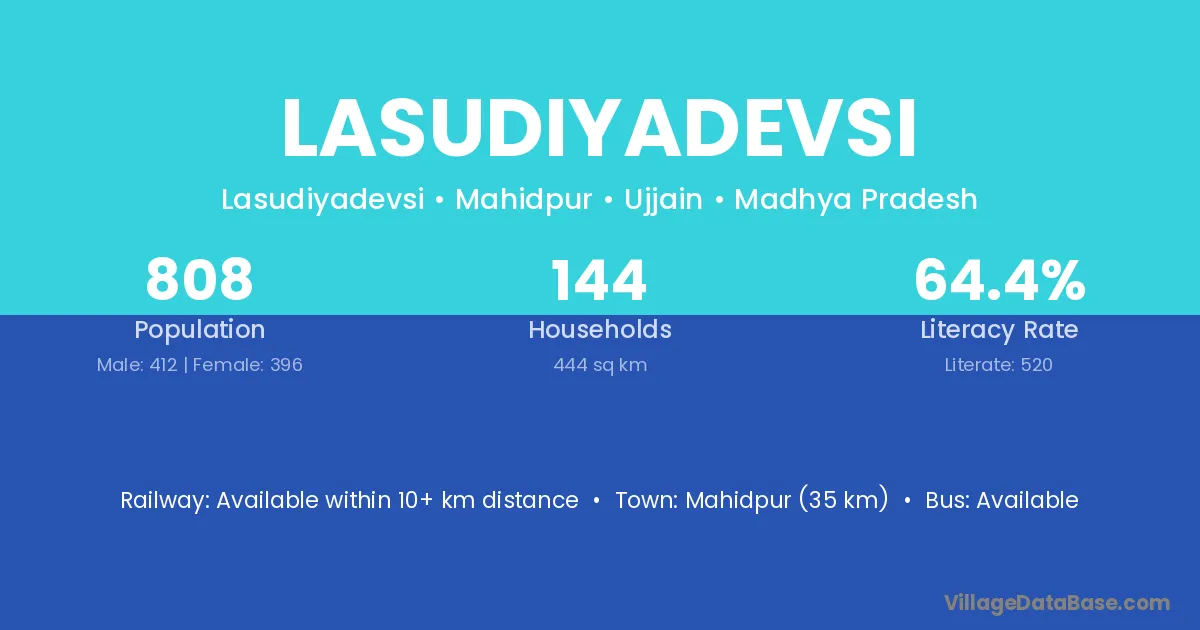 Mahidpur (35 km) is the nearest town to Lasudiyadevsi village for major economic activities and is located approximately 35 km away.