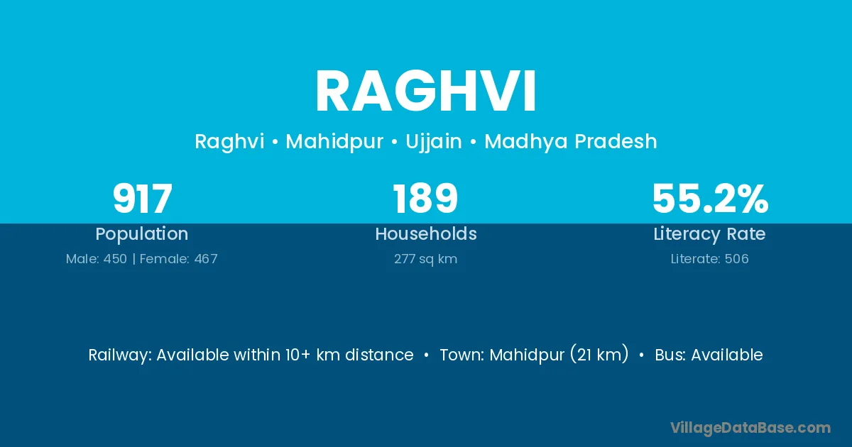 Mahidpur (21 km) is the nearest town to Raghvi village for major economic activities and is located approximately 21 km away.