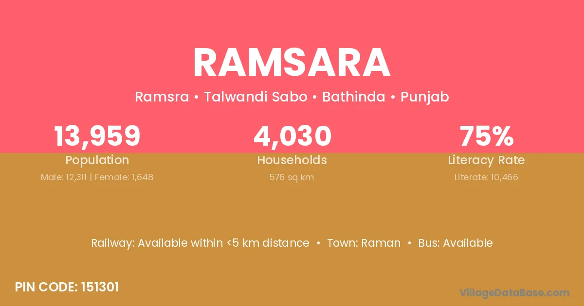 The literacy rate of Ramsara village is 64.10%. Male literacy stands at 76.13% and female literacy at 51.94%.
