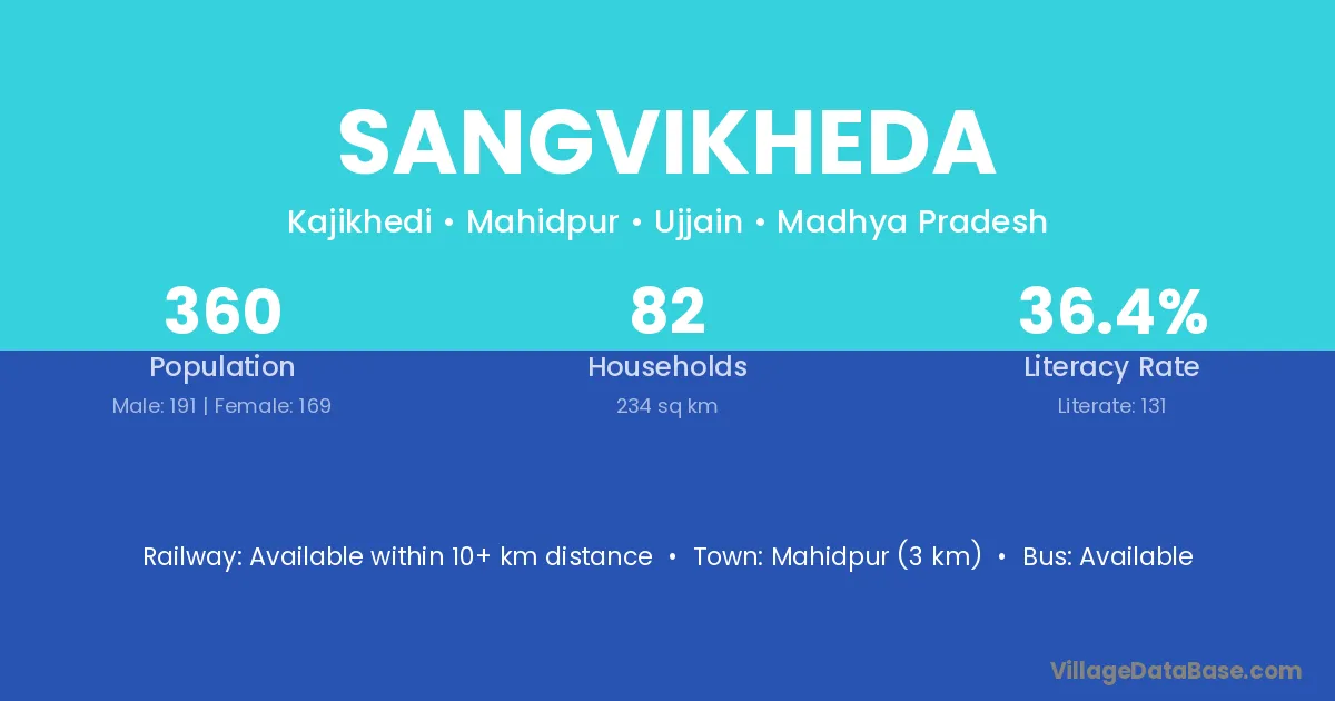 Mahidpur (3 km) is the nearest town to Sangvikheda village for major economic activities and is located approximately 3 km away.