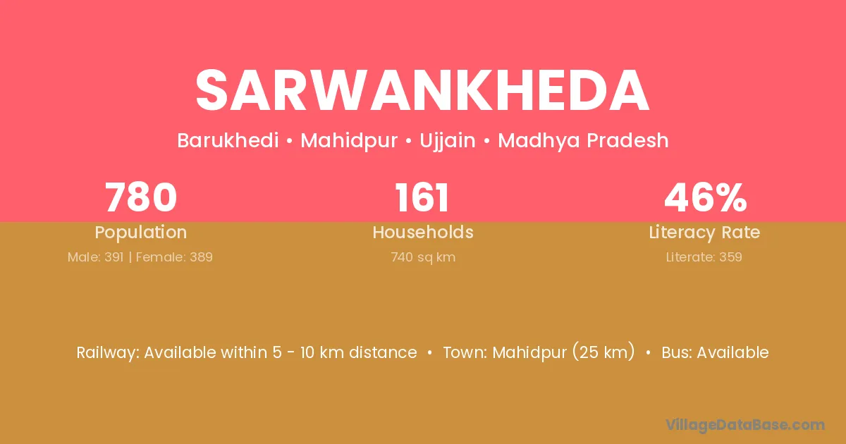 Mahidpur (25 km) is the nearest town to Sarwankheda village for major economic activities and is located approximately 25 km away.