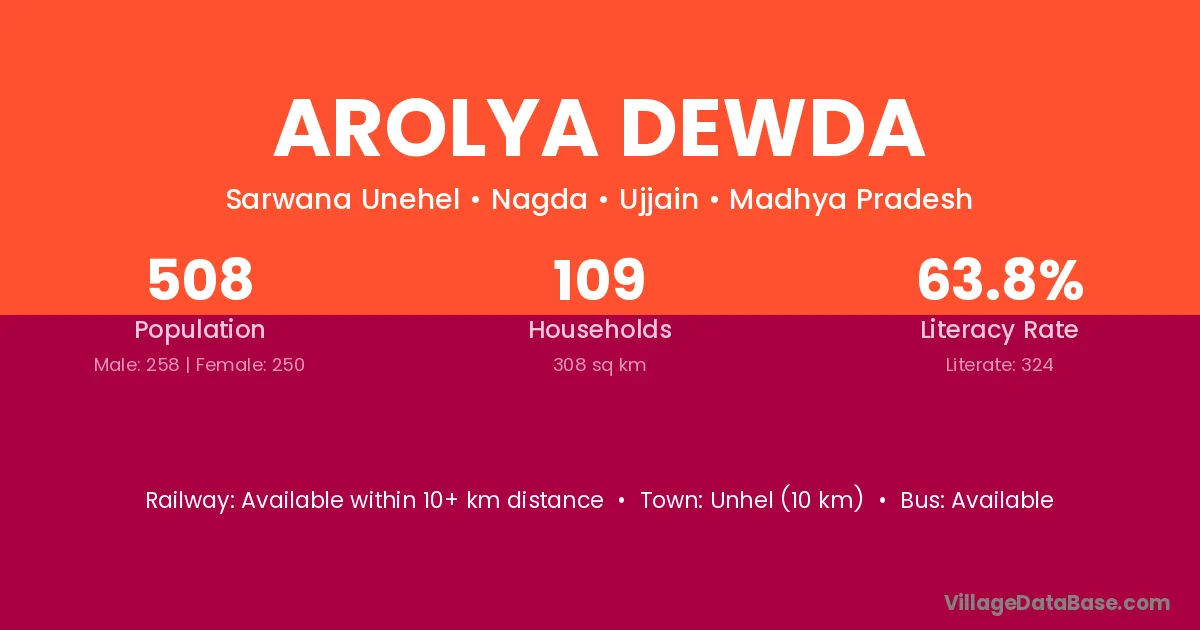 Arolya Dewda village has a total population of 508 people, of which 258 are males and 250 are females.