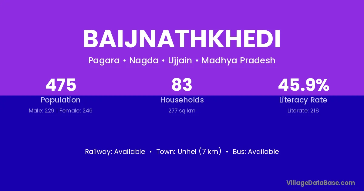 Baijnathkhedi village has a total population of 475 people, of which 229 are males and 246 are females.