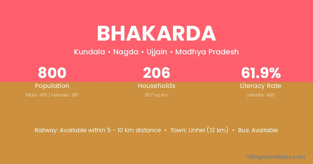 Bhakarda village has a total population of 800 people, of which 419 are males and 381 are females.