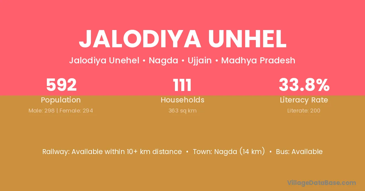 Jalodiya Unhel village has a total population of 592 people, of which 298 are males and 294 are females.