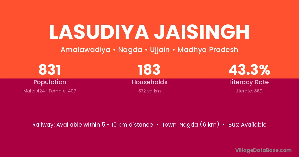 Nagda (6 km) is the nearest town to Lasudiya Jaisingh village for major economic activities and is located approximately 6 km away.