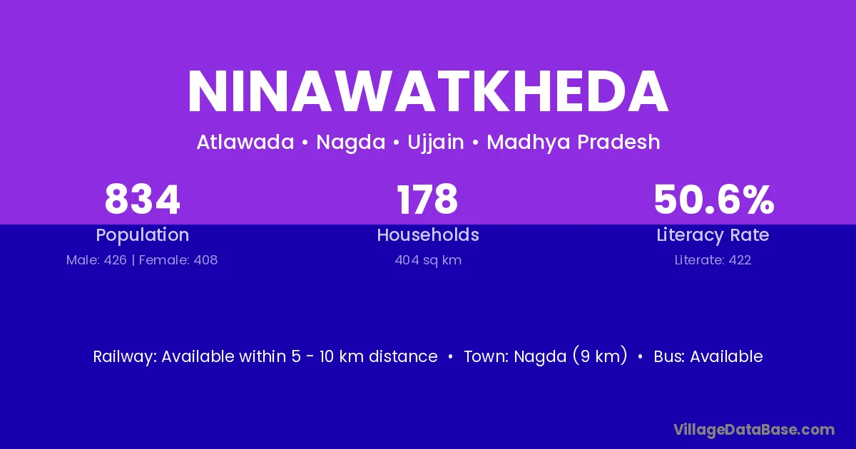 Ninawatkheda village has a total population of 834 people, of which 426 are males and 408 are females.