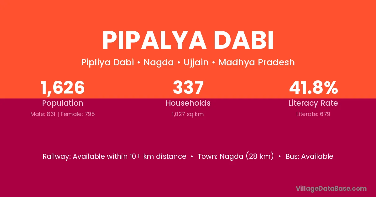 Pipalya Dabi village has a total population of 1,626 people, of which 831 are males and 795 are females.