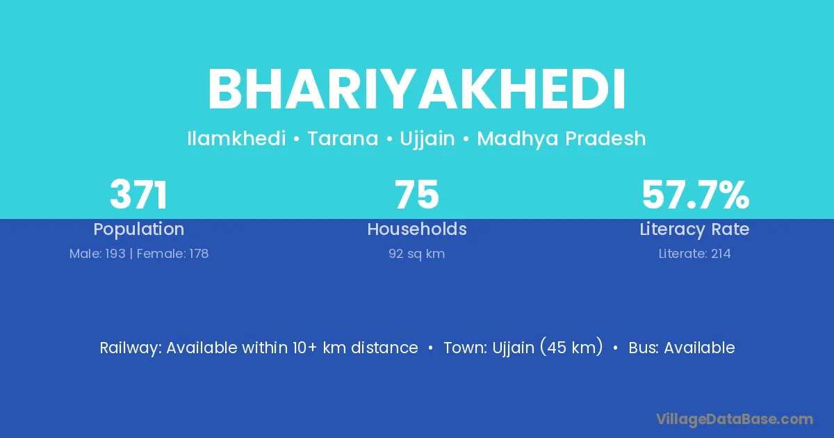 Bhariyakhedi village has a total population of 371 people, of which 193 are males and 178 are females.