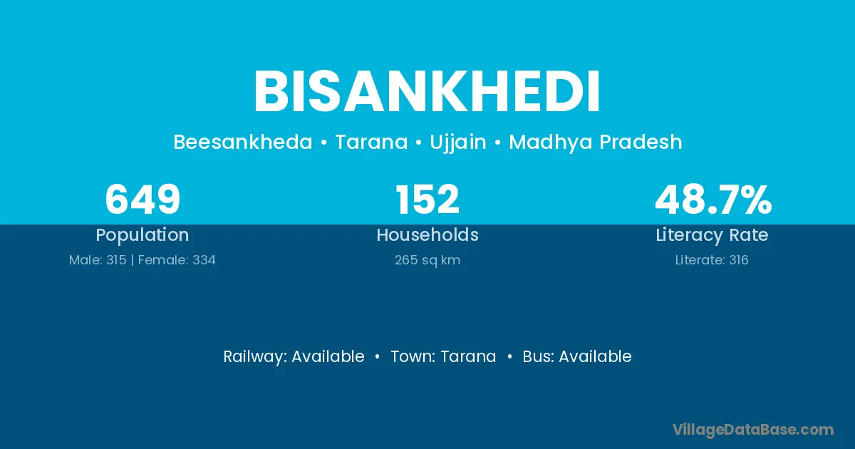 Bisankhedi village has a total population of 649 people, of which 315 are males and 334 are females.