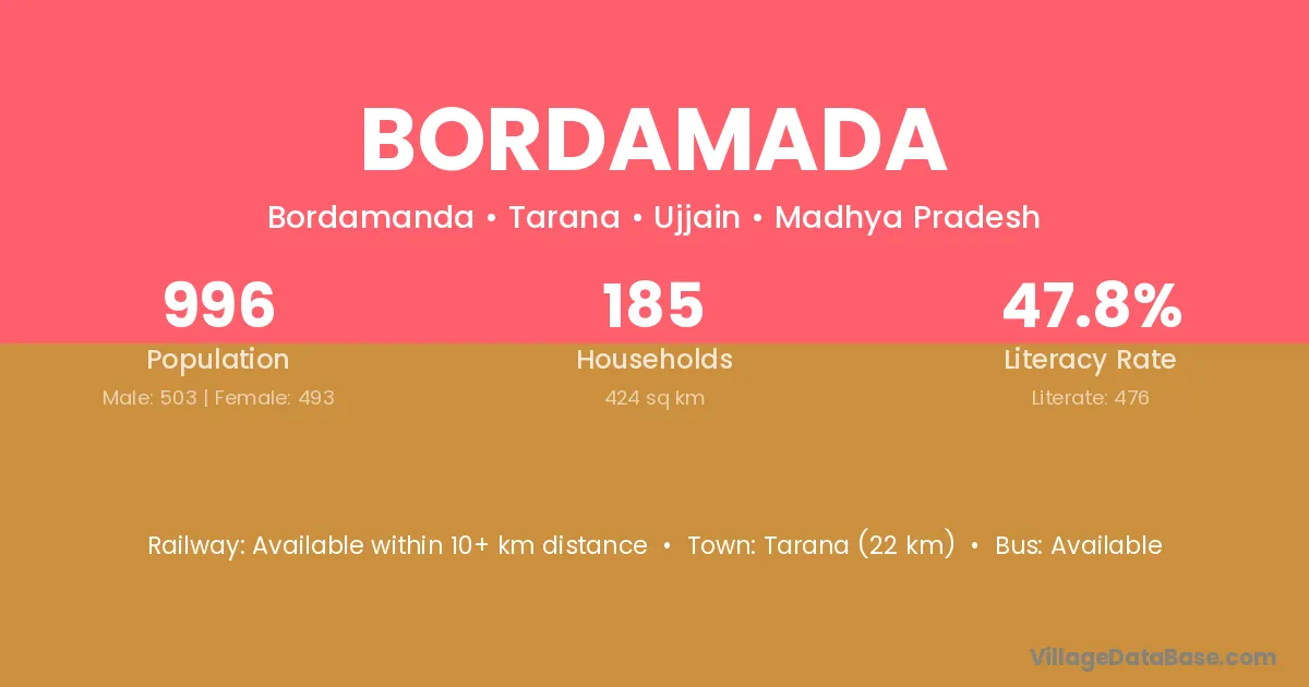 Tarana (22 km) is the nearest town to Bordamada village for major economic activities and is located approximately 22 km away.