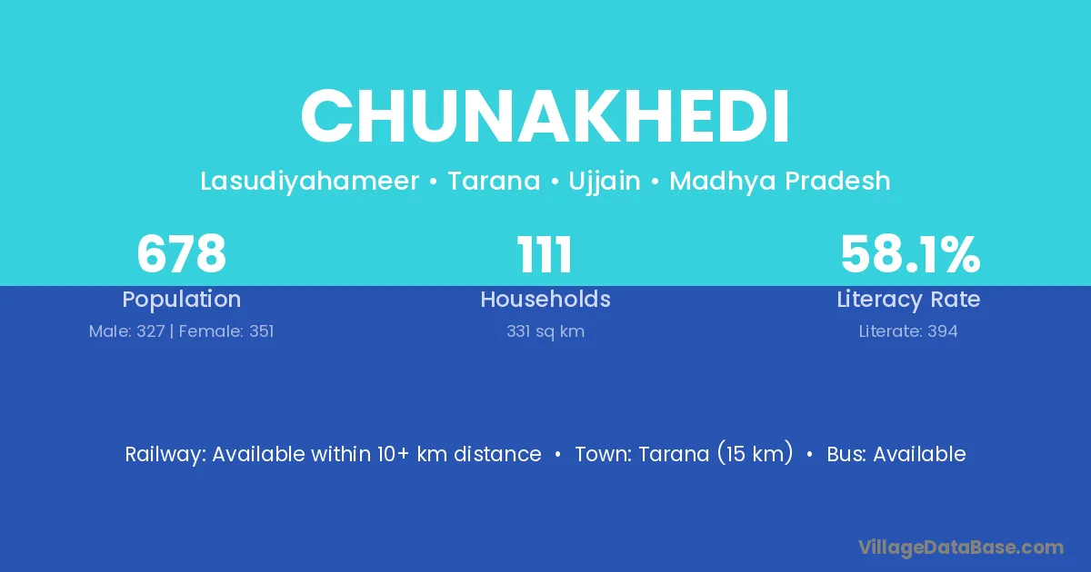 Chunakhedi village has a total population of 678 people, of which 327 are males and 351 are females.