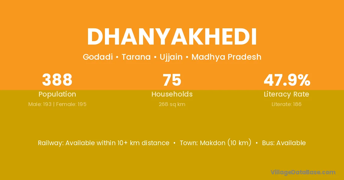 Dhanyakhedi village has a total population of 388 people, of which 193 are males and 195 are females.