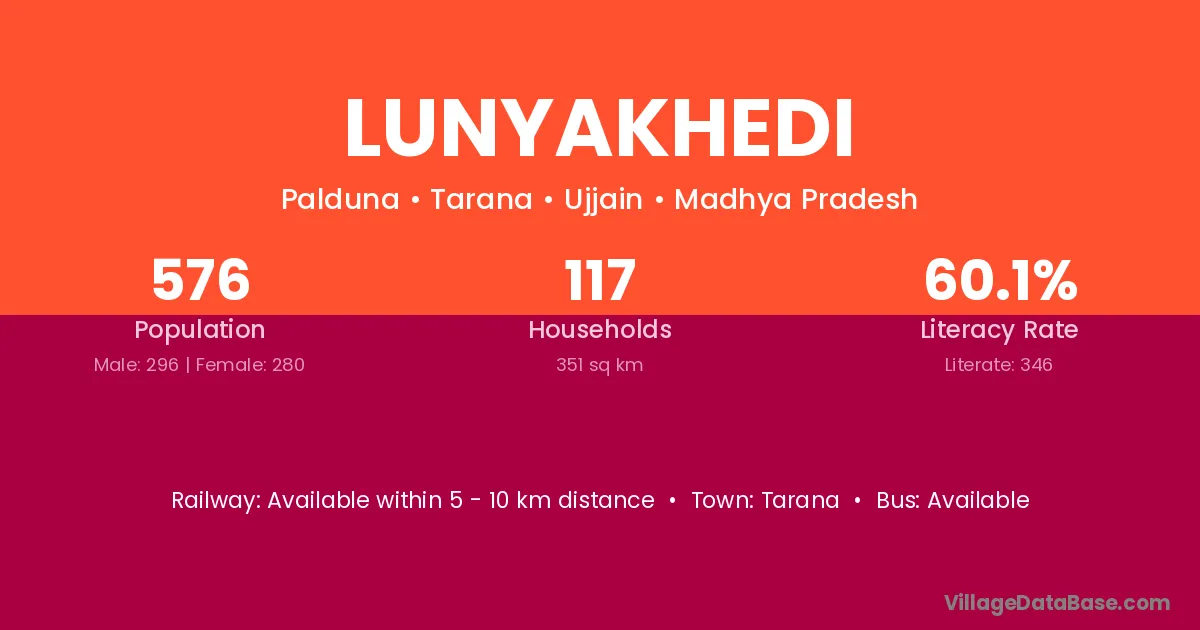 Lunyakhedi village has a total population of 576 people, of which 296 are males and 280 are females.