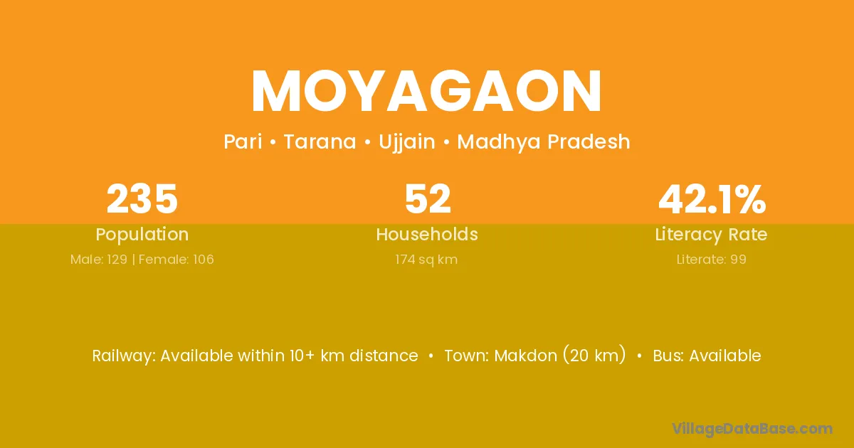 Moyagaon village has a total population of 235 people, of which 129 are males and 106 are females.