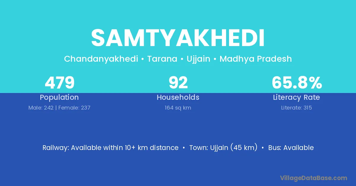 Ujjain (45 km) is the nearest town to Samtyakhedi village for major economic activities and is located approximately 45 km away.