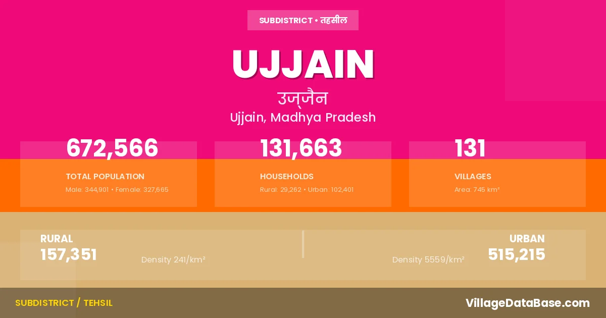 According to the 2011 census The total area of Ujjain Tehsil is 745 km², with a population of 672566 people. The population density is 903 inhabitants per square kilometre, and there are approximately 131663 houses in the sub district.
