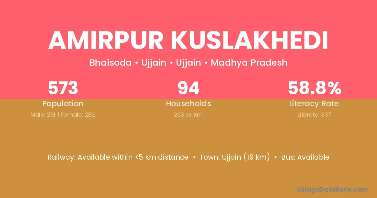 Amirpur Kuslakhedi village has a total population of 573 people, of which 291 are males and 282 are females.