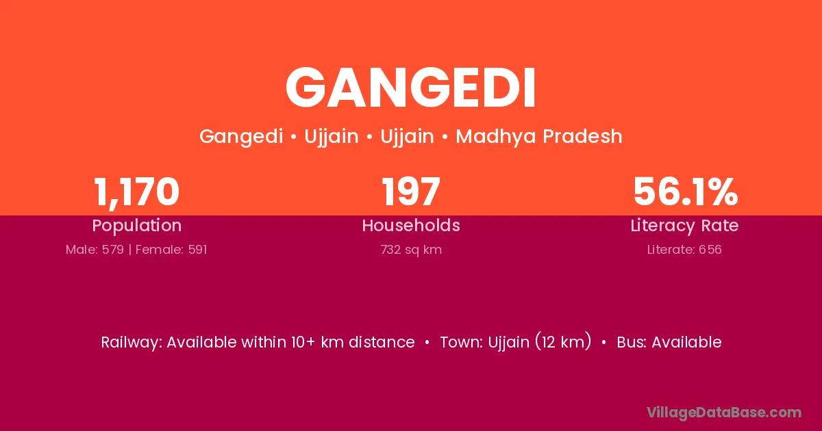 Ujjain (12 km) is the nearest town to Gangedi village for major economic activities and is located approximately 12 km away.