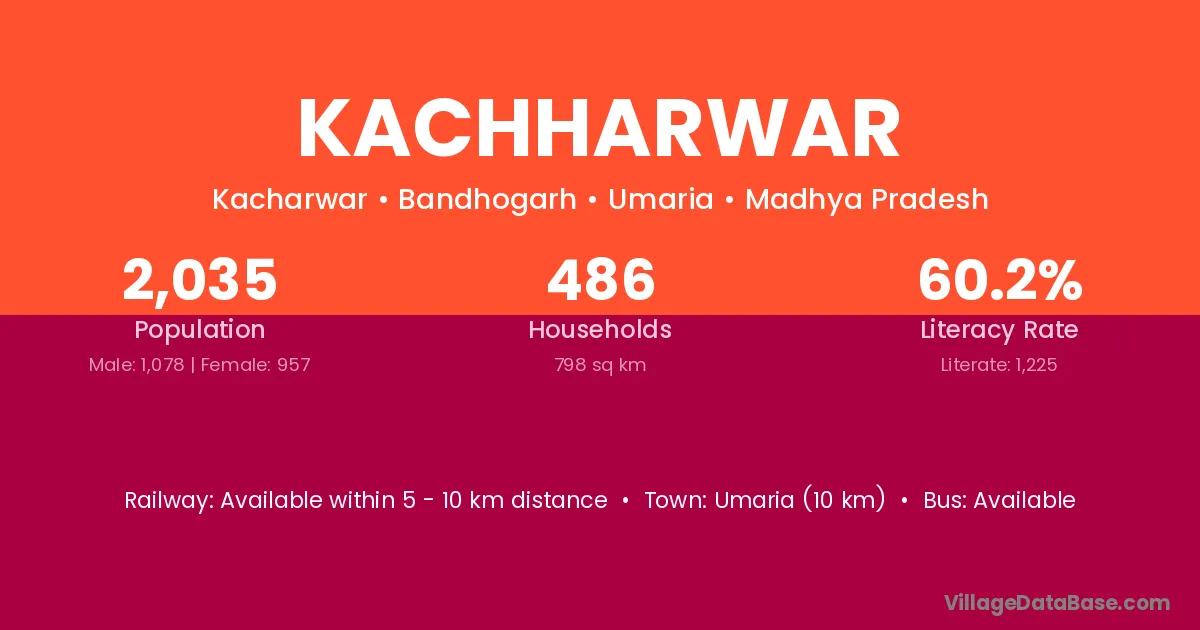 Umaria (10 km) is the nearest town to Kachharwar village for major economic activities and is located approximately 10 km away.