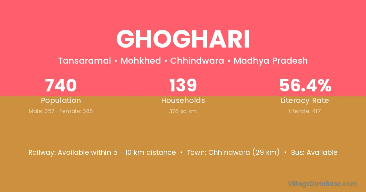 Umaria (30 km) is the nearest town to Ghoghari village for major economic activities and is located approximately 30 km away.