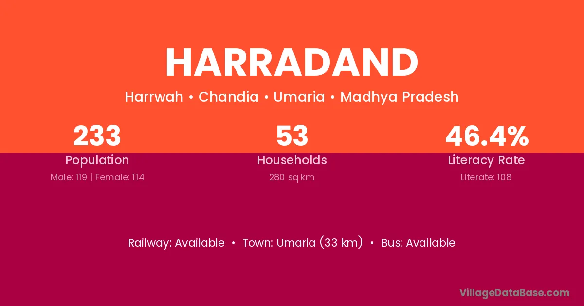 Umaria (33 km) is the nearest town to Harradand village for major economic activities and is located approximately 33 km away.