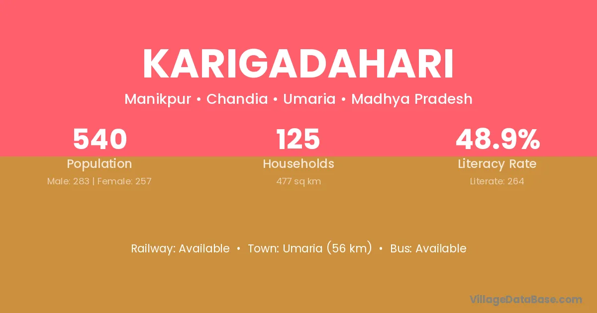 Umaria (56 km) is the nearest town to Karigadahari village for major economic activities and is located approximately 56 km away.