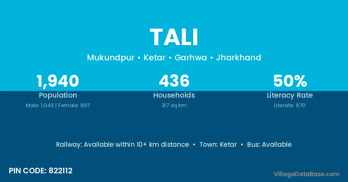 The literacy rate of Tali village is 43.61%. Male literacy stands at 52.50% and female literacy at 33.98%.