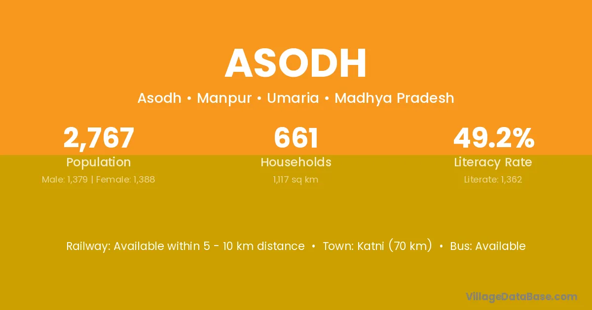 Katni (70 km) is the nearest town to Asodh village for major economic activities and is located approximately 70 km away.