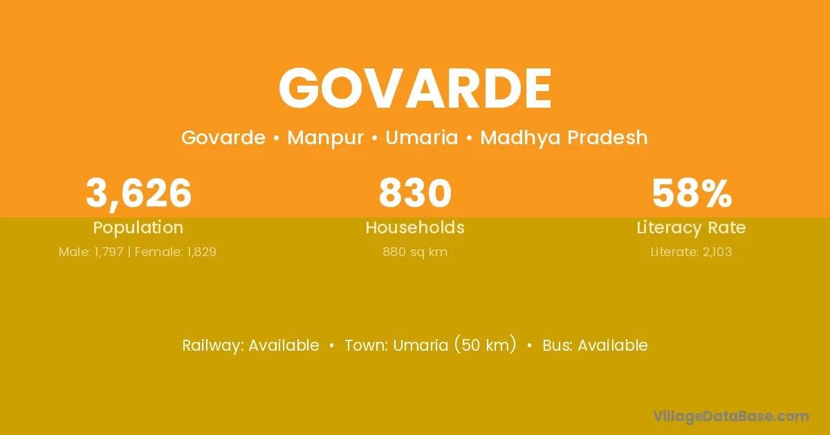 Umaria (50 km) is the nearest town to Govarde village for major economic activities and is located approximately 50 km away.