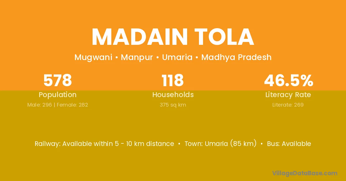 Umaria (85 km) is the nearest town to Madain Tola village for major economic activities and is located approximately 85 km away.