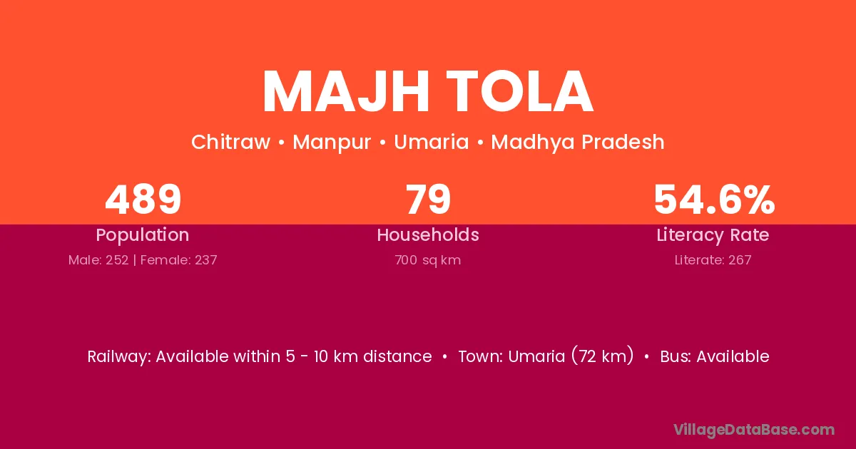 Majh Tola village has a total population of 489 people, of which 252 are males and 237 are females.