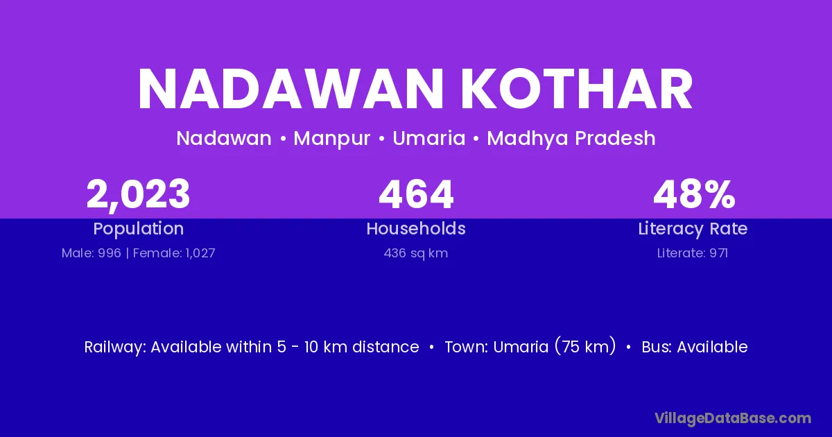 Umaria (75 km) is the nearest town to Nadawan Kothar village for major economic activities and is located approximately 75 km away.
