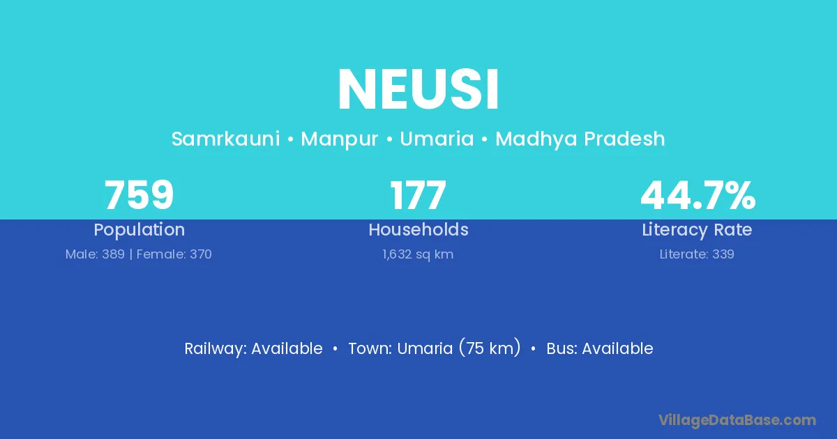 Umaria (75 km) is the nearest town to Neusi village for major economic activities and is located approximately 75 km away.