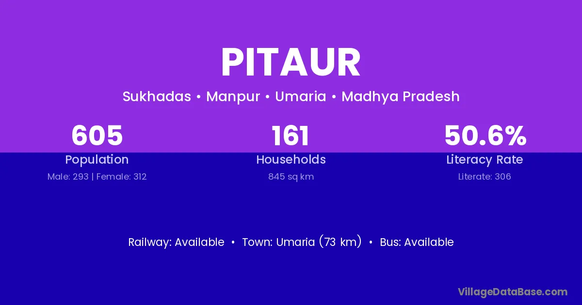 Umaria (73 km) is the nearest town to Pitaur village for major economic activities and is located approximately 73 km away.