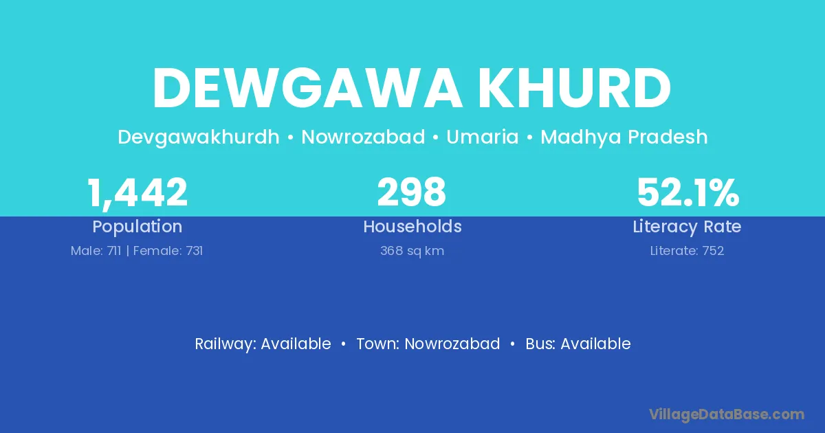 Dewgawa Khurd village has a total population of 1,442 people, of which 711 are males and 731 are females.