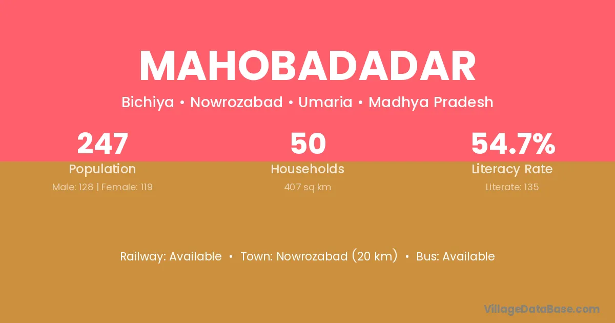 Nowrozabad (20 km) is the nearest town to Mahobadadar village for major economic activities and is located approximately 20 km away.