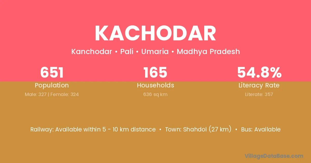 Shahdol (27 km) is the nearest town to Kachodar village for major economic activities and is located approximately 27 km away.