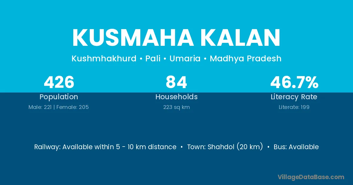 Shahdol (20 km) is the nearest town to Kusmaha Kalan village for major economic activities and is located approximately 20 km away.