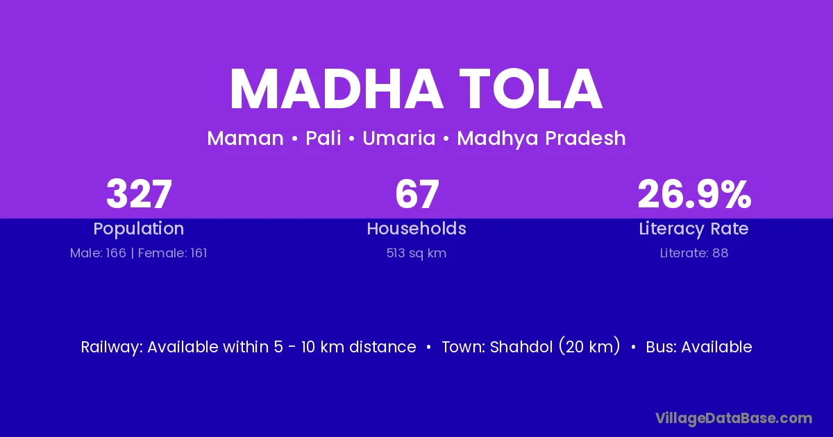 Shahdol (20 km) is the nearest town to Madha Tola village for major economic activities and is located approximately 20 km away.