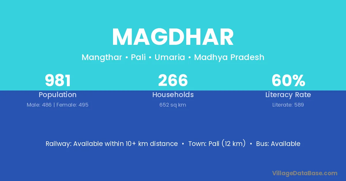 Pali (12 km) is the nearest town to Magdhar village for major economic activities and is located approximately 12 km away.
