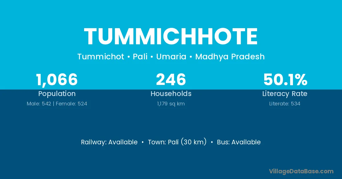 Pali (30 km) is the nearest town to Tummichhote village for major economic activities and is located approximately 30 km away.