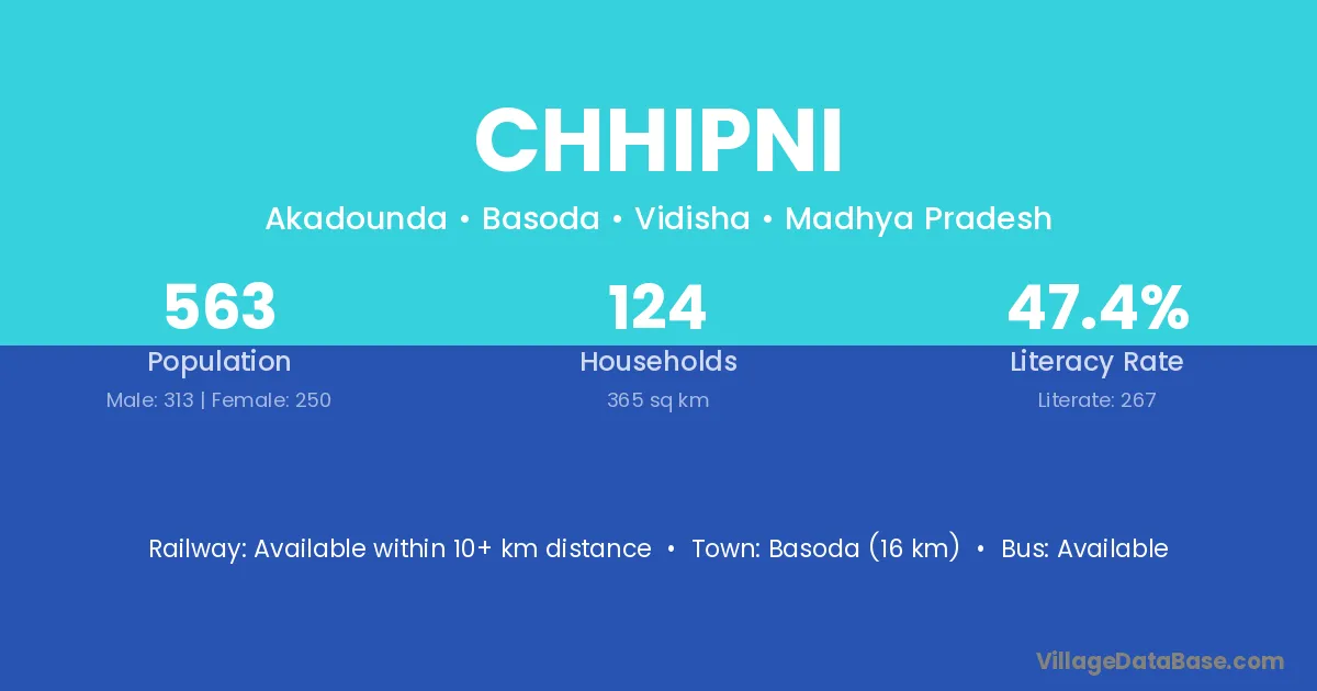 Basoda (16 km) is the nearest town to Chhipni village for major economic activities and is located approximately 16 km away.