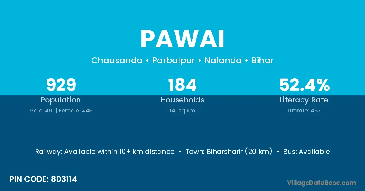 The literacy rate of Pawai village is 64.80%. Male literacy stands at 72.85% and female literacy at 56.19%.